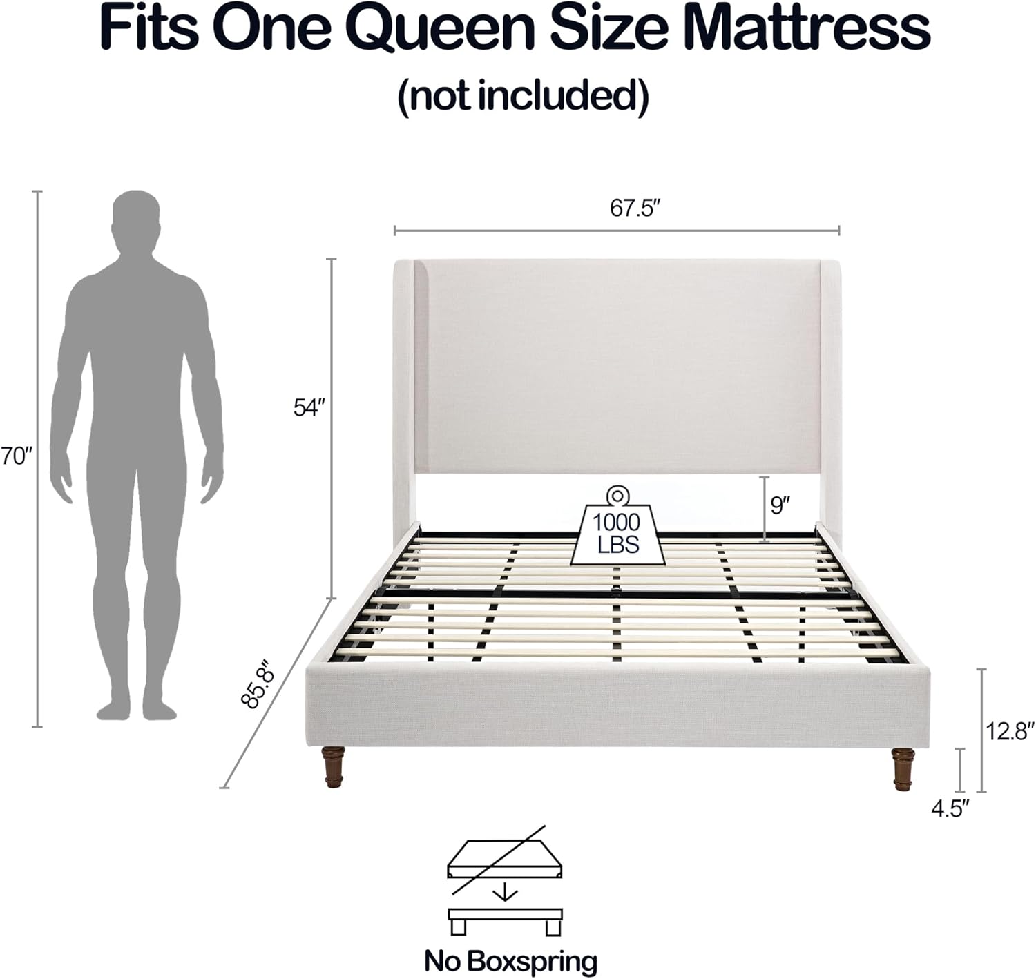 54" Extra-Tall Headboard Bed Frame - Heavy Duty Wingback Upholstered Platform Bed in Premium Chenille, Supports 1000lbs, No Box Spring Needed, Solid Wood Feet (Textured Ivory Canvas, Queen)