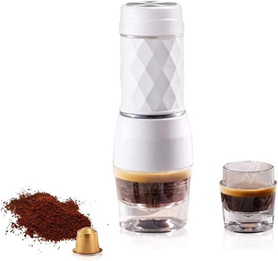 1.2 in 1 Design:Espresso maker compatible with coffee powder or coffee capsules.Simply add hot water,coffee powder or coffee capsules, then hand pump.You can enjoy delicious coffee anytime 2.Perfect System:The unique pressure sealing system & pressure maintaining system design ensures that the actual pressure reaches 13-18 bar, which can releasing the original aroma of coffee,make the coffee taste smoother and more delicate 3.Portable:5x3x3 in,0.81KG. The lightweight and compact design means it can easily fit into your handbag or backpack and is perfect for coffee connoisseurs 4.Manual Coffee Maker:There's no electricity or batteries are required.Just need to take a bottle of hot water and this manual coffee maker, then you can enjoy coffee time wherever you go.It's perfect for Hiking, Camping, Fishing,Picnics and Travel 5.High-end Material:The pressure rod is made of 304 food grade stainless steel, which is smoother and does not rust.The exquisitely shaped cup is firm, odorless, easy to clean and reusable.Fashionable and trendy rhombus design, good hand feeling, easy to grip and non-slip