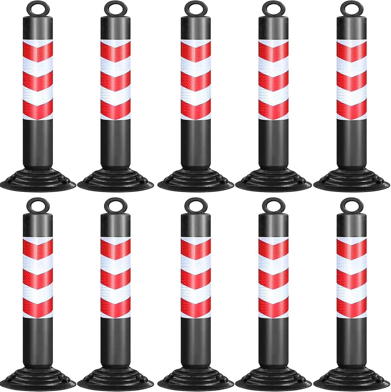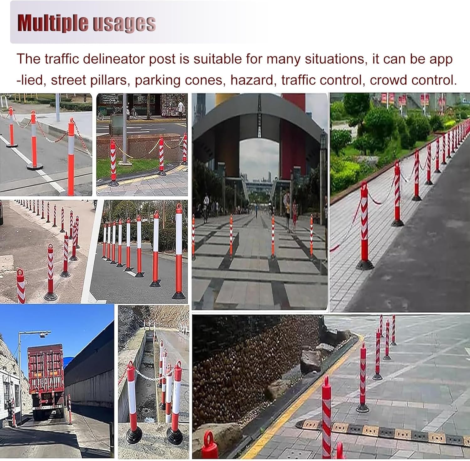 Description:- Specifications:- Product Name: Traffic Road Cones- Material: PU Plastic- Pole Dia: 9.5cm (3.7in)- Base Dia: 23cm (9.1in)- Post Height: 80cm(31.5in),100cm(39.4in),- Installation: Floor MountedFeatures:- Elastic cord design,quick rebound.- Hanging ring design can be carried conveniently,can be used with chain.- Bright reflective band can improve visibility.- Detachable base,easy to removable and install.- Each bollard has 3 pre-drilled holes for easy installation.- The barricade posts are often put outside the entrance of expressways,parks,neighborhoods,intersections,parking spots,and streets.Package contents:- Delineator Post- Includes installation accessories: screw kitPrecautions:- Manual measurement,product size and physical appearance may have an error of 1 ~ 3cm.- Products are taken in kind,but due to light,equipment,shooting angle and computer resolution,the physical and photos received may be different,in kind prevail.- Pictures for reference,the specific size for the size of the purchase.